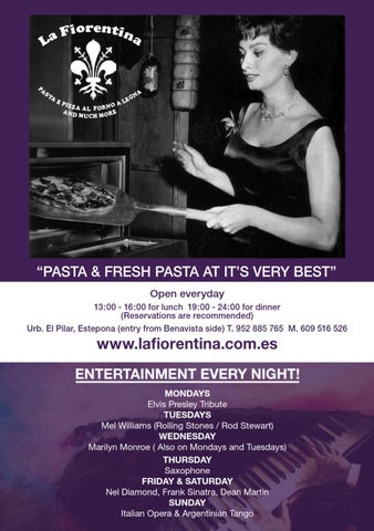 www.lafiorentina.com.es ENTERTAINMENT EVERY NIGHT! MONDAYS Elvis Presley Tribute TUESDAYS Mel Williams (Rolling Stones / Rod Stewart) WEDNESDAY Marilyn Monroe ( Also on Mondays and Tuesdays) THURSDAY Saxophone FRIDAY & SATURDAY Nel Diamond, Frank Sinatra, Dean Martin SUNDAY Italian Opera & Argentinian Tango 133