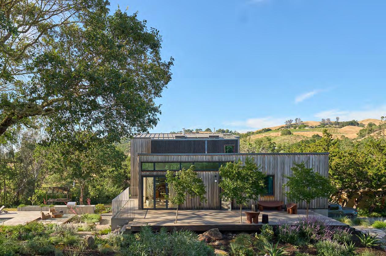 Opposite: The lower level Rootdown tasting room is insulated by the surrounding hillside. An elaborately veined gray marble counter anchors the space. This page: The angular exterior facade is blackened shou-sugiban wood and native California Monterey cypress reclaimed by local artisan Evan Shivley of Aborica. The unfinished wood will naturally patina and turn silver over time. Leon Hordijk of Studio
