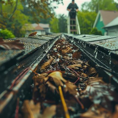 Afterastorm,guttersoftenendupfillingwithleaves,twigs,roof granules,anddirt.Ifnotcleanedpromptly,debrisbuildupleadsto: