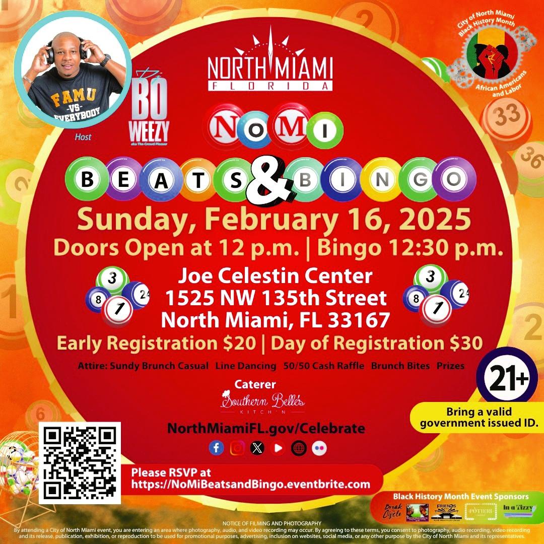 As part of the City of North Miami’s 2025 Black History Month festivities, NoMi Beats & Bingo is one of several exciting events highlighting culture, music, and community engagement. To view the full lineup of Black History Month events, visit: www.NorthMiamiFL.gov/Celebrate.