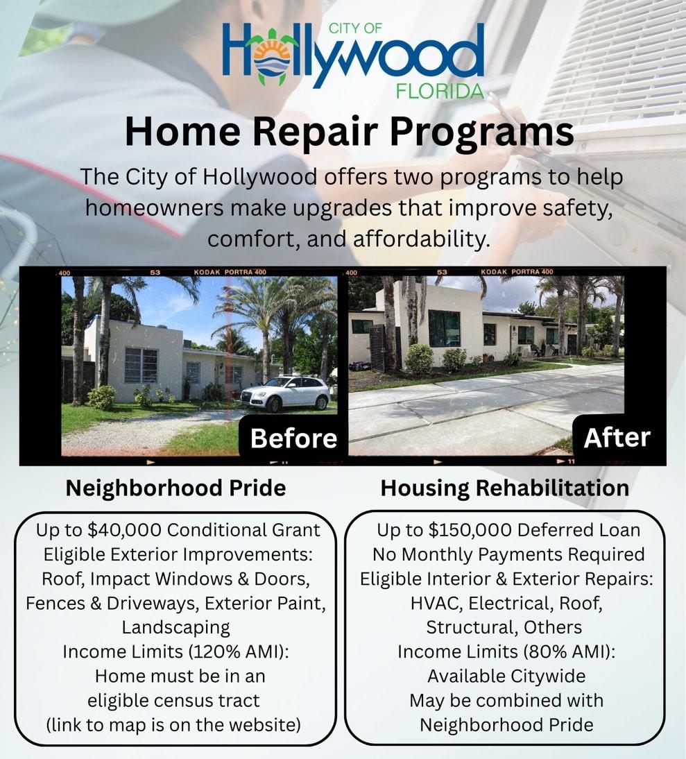 The City of Hollywood continues to invest in neighborhood stability and housing quality by offering programs that help eligible homeowners make important repairs and upgrades to their homes. Through the Neighborhood Pride Program and the Housing Rehabilitation Program, residents may receive financial assistance for improvements that enhance safety, improve energy efficiency and help preserve the long-term value of their homes.