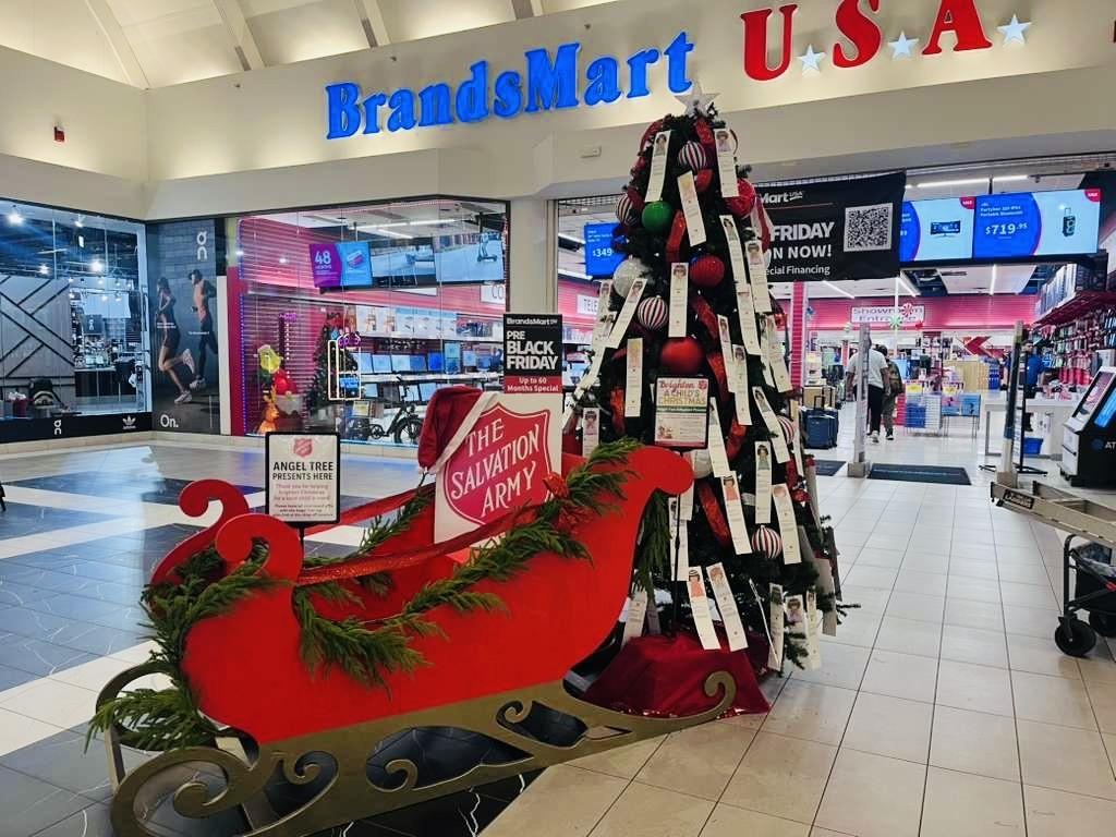 The Salvation Army of Broward County Angel Tree and handmade sleigh at the Sawgrass Mall.