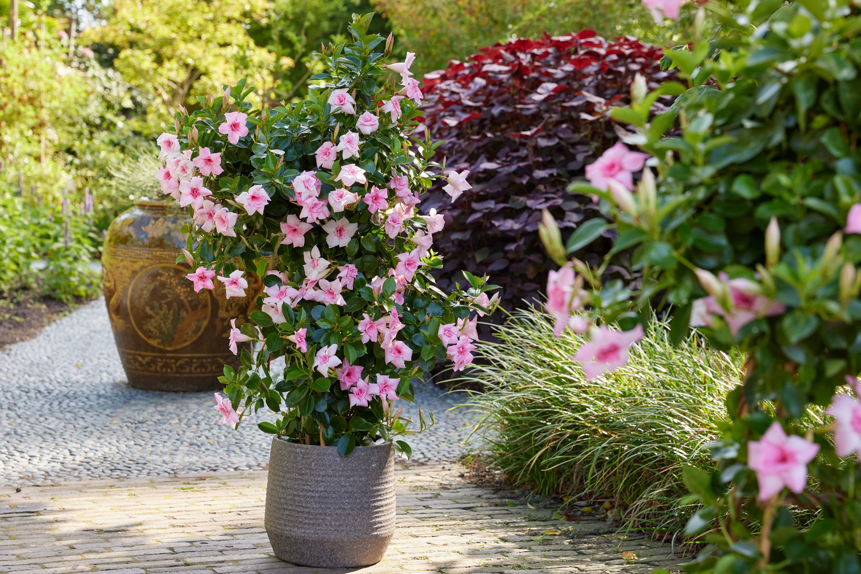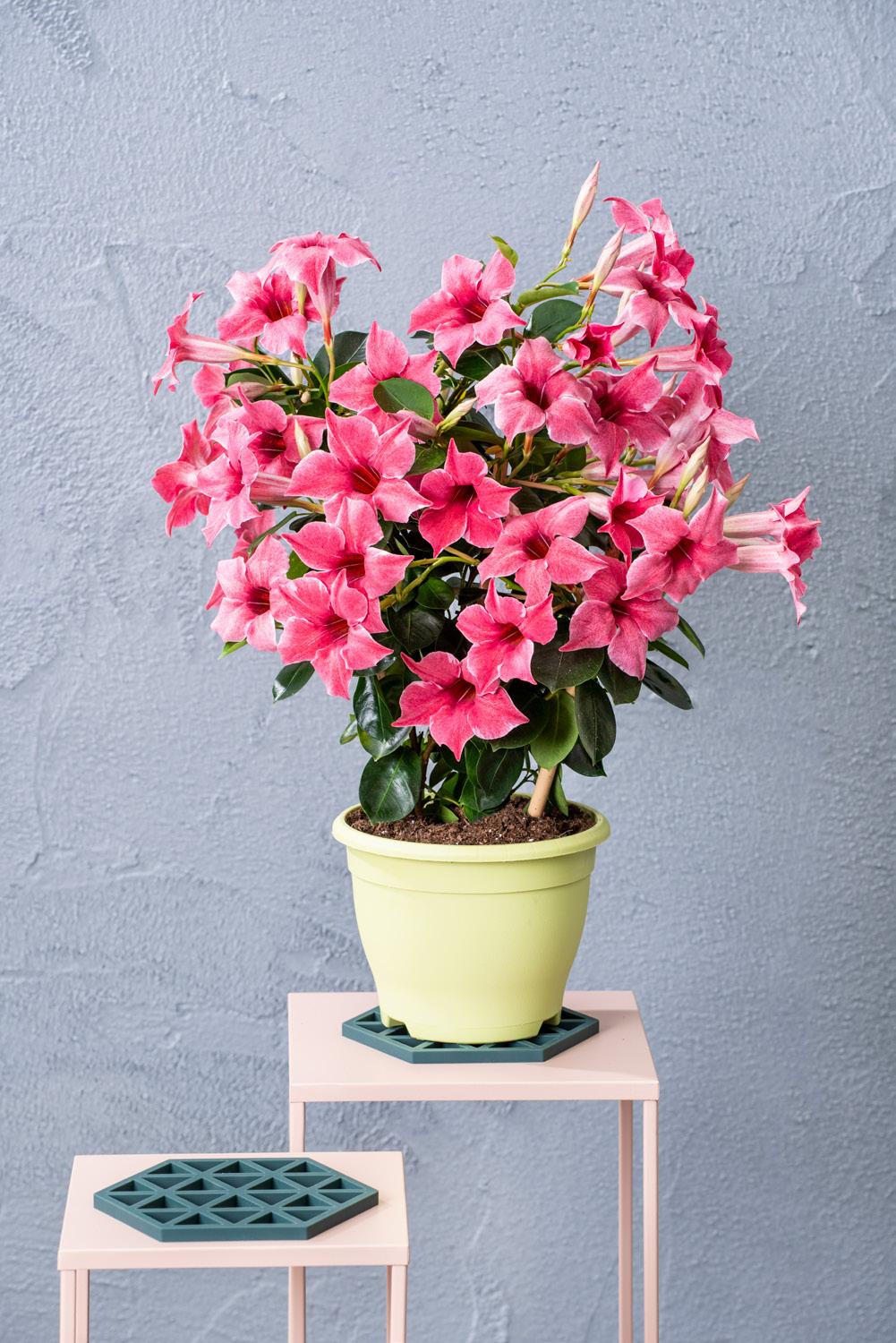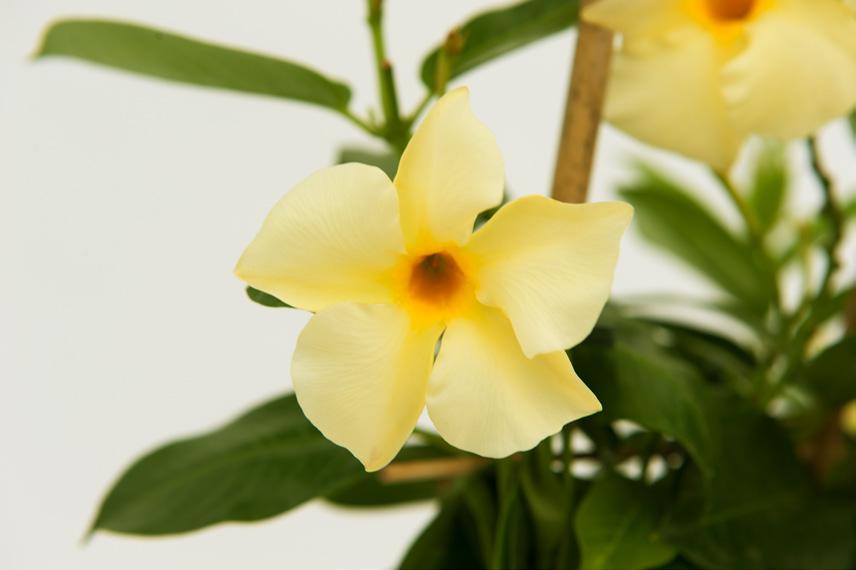 This new variety shines like a ray of sunshine, which is why it bears the name gold. This Mandevilla rises to the sky, colouring the small, round, emerald-green leaves a warm yellow. It grows vigorously, flowers early and the flowers are a good 7 cm large!