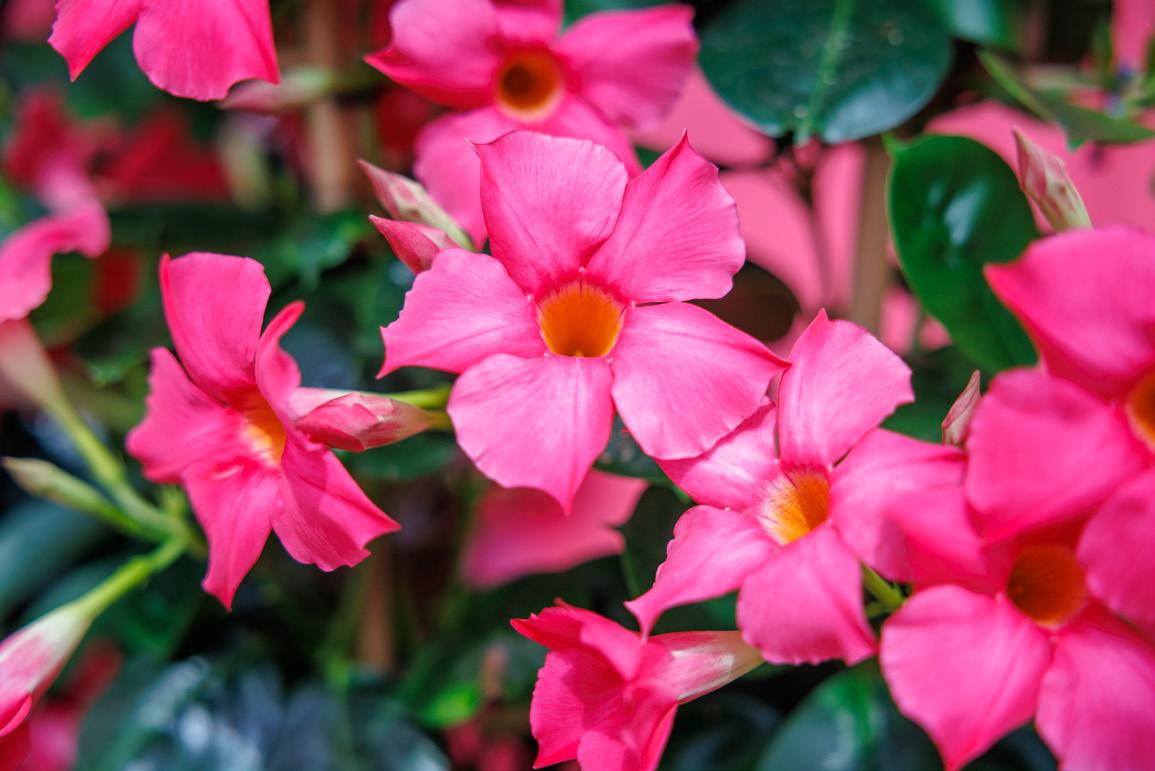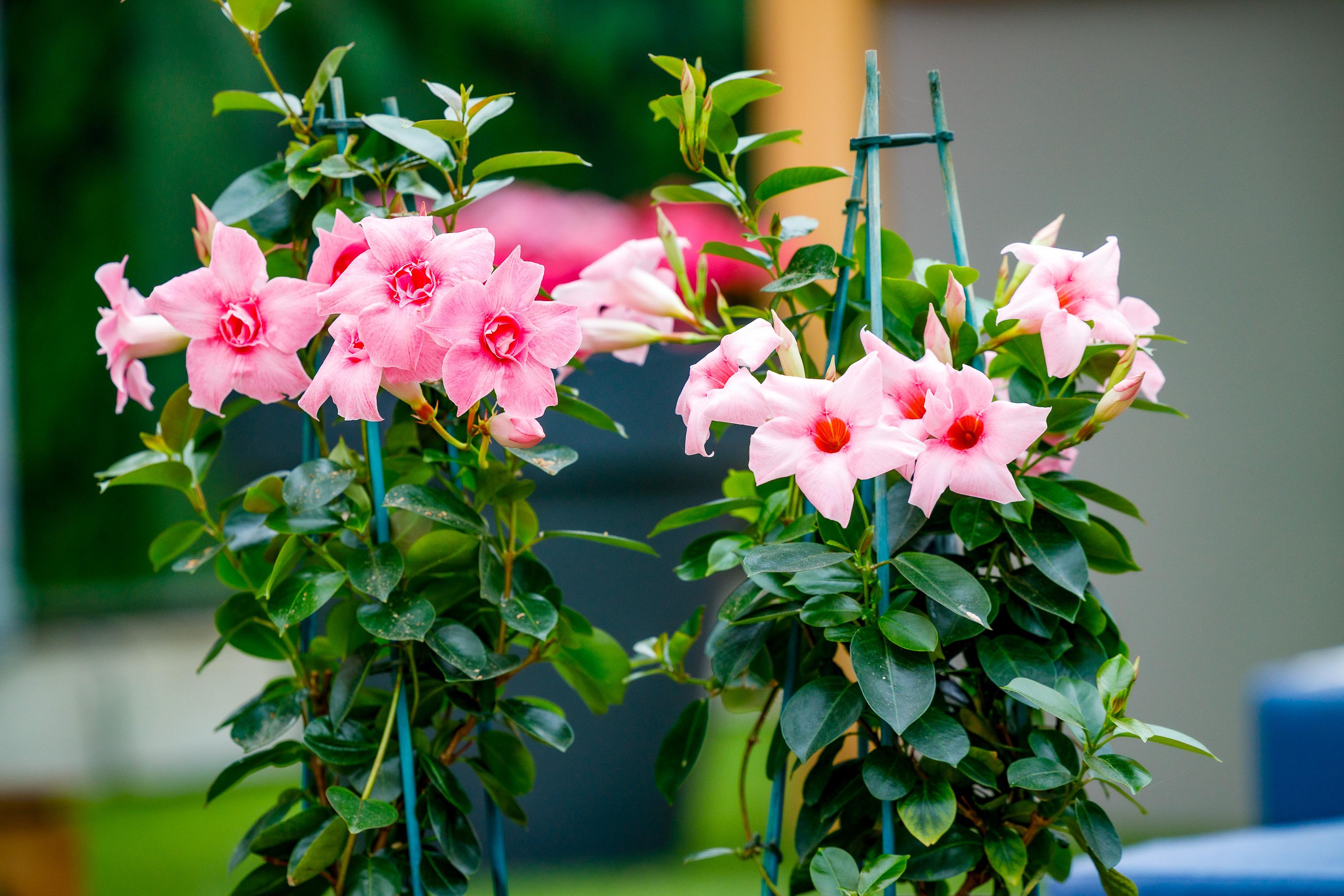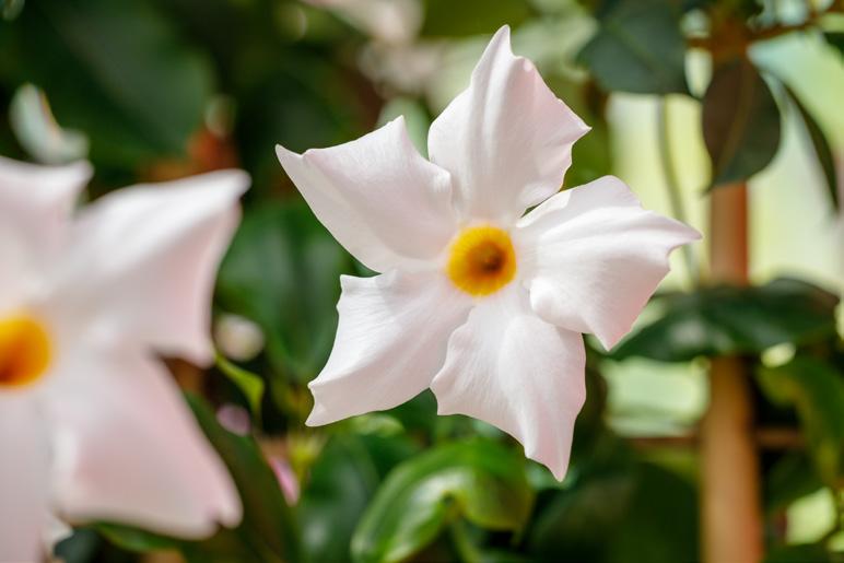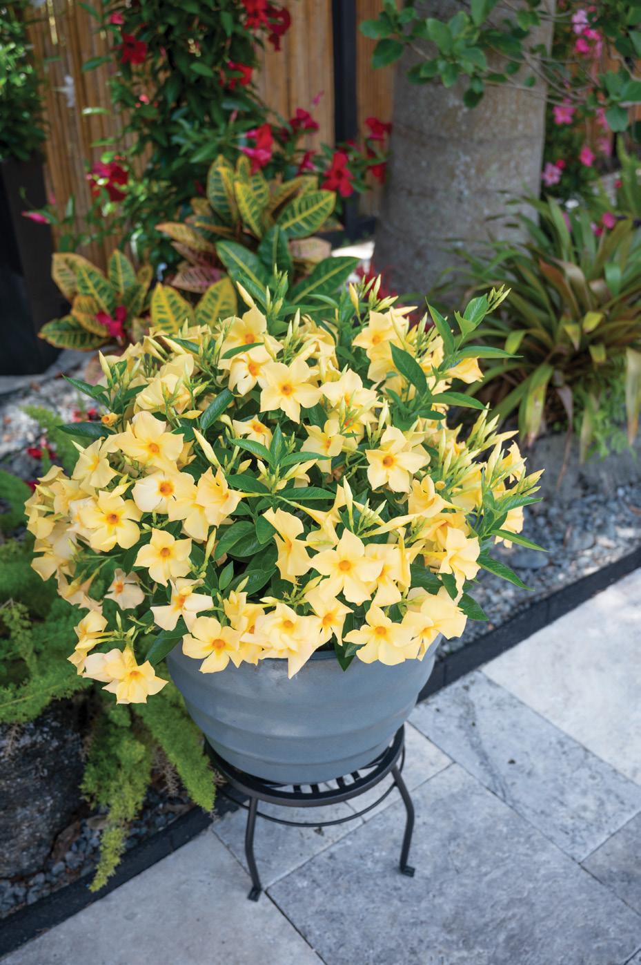 This new variety shines like a ray of sunshine, which is why it bears the name gold. This Mandevilla rises to the sky, colouring the small, round, emerald-green leaves a warm yellow. It grows vigorously, flowers early and the flowers are a good 7 cm large!