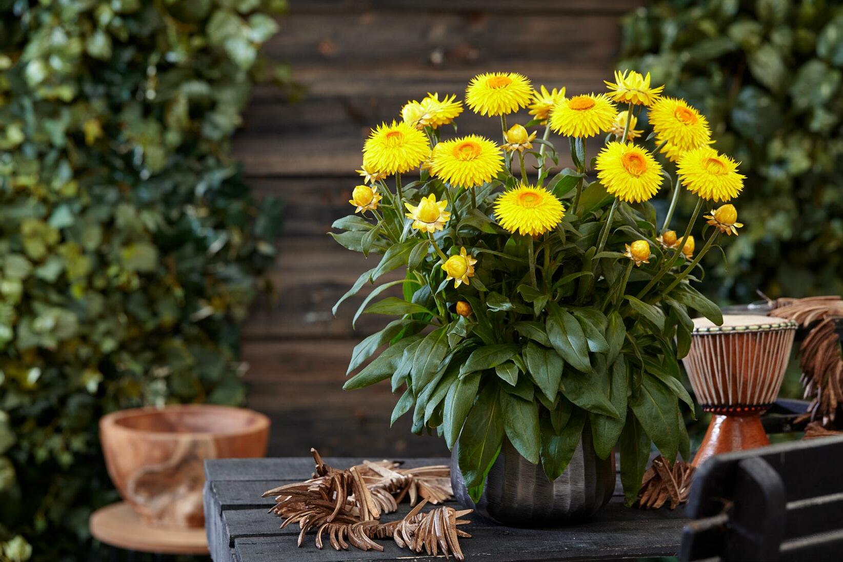 The most impressive novelty in the Granvia® family belongs to this flaming, firing, red coloured variety. The brilliance of the still-closed straw flowers certainly stands out. Once opened, the contrast between the heart & the rustling petals is absolutely remarkable.