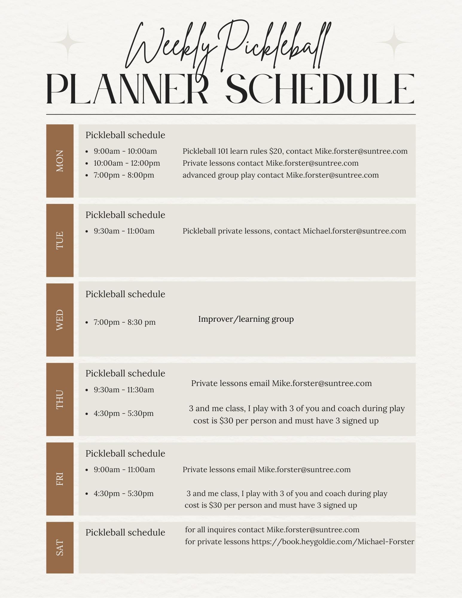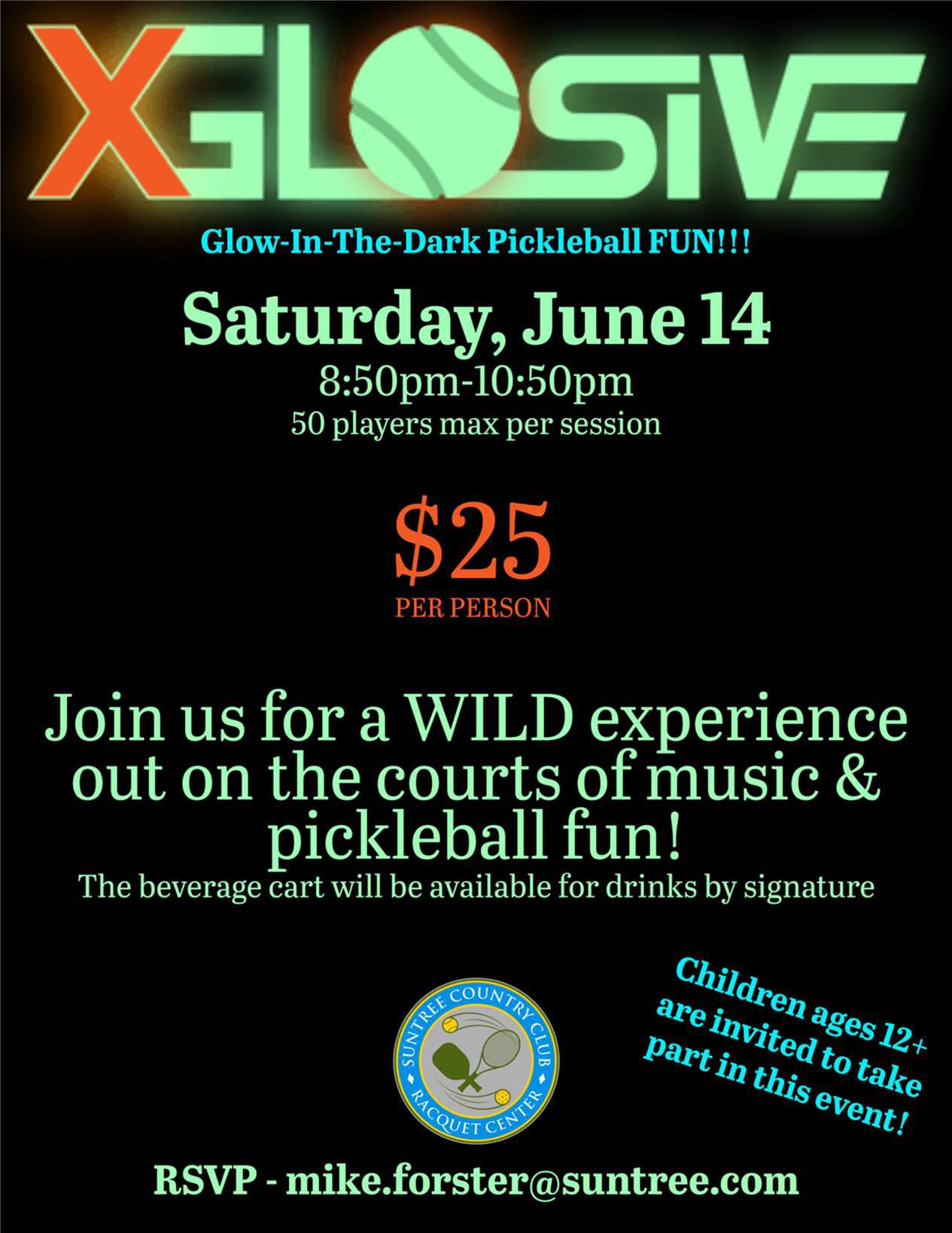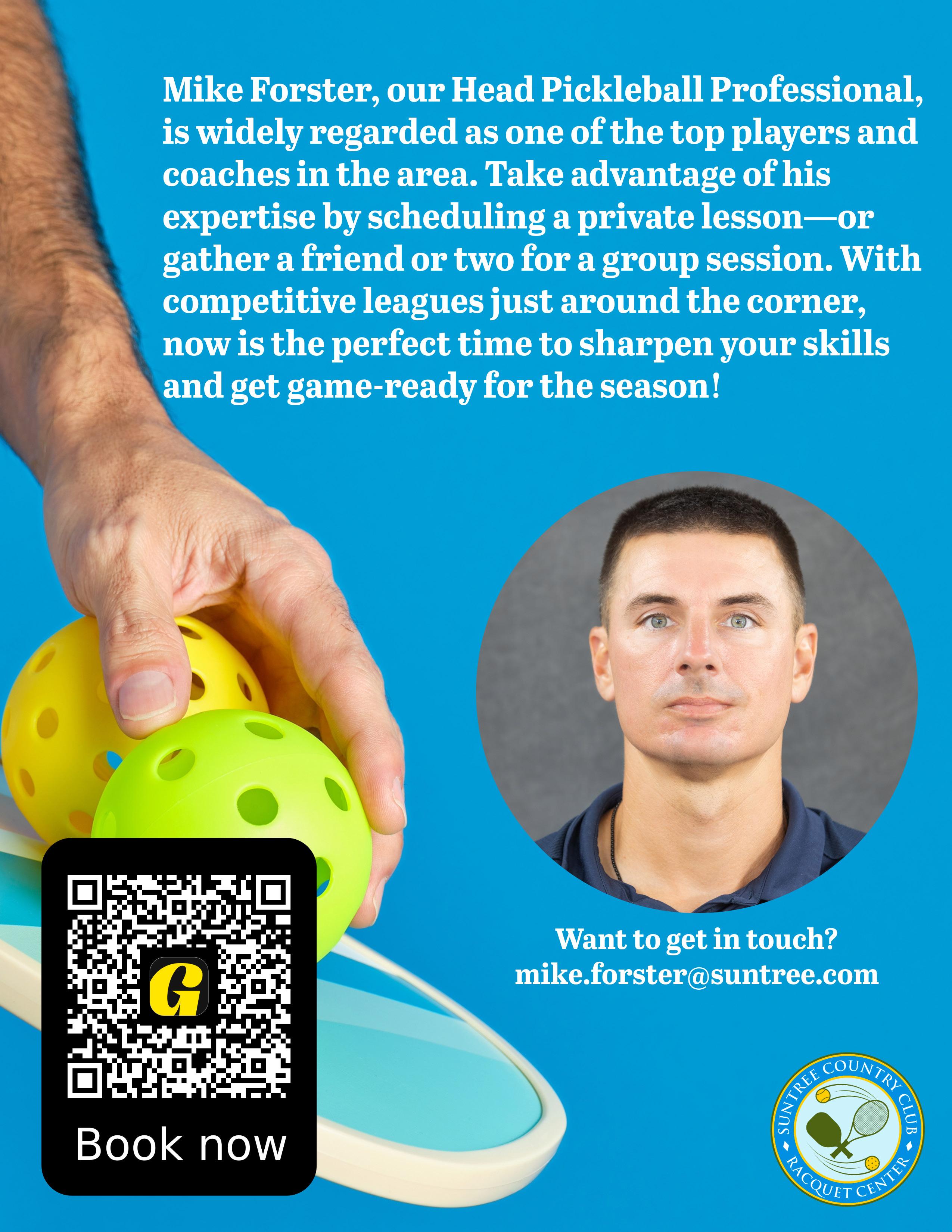 Pickleball Club Championships: November 7th Singles 6pm. Men’s and Women’s Doubles November 8th 8am. Mixed Doubles November 8th 12pm. $25 per player. Sign up on the calendar or email mike.forster@suntree.com