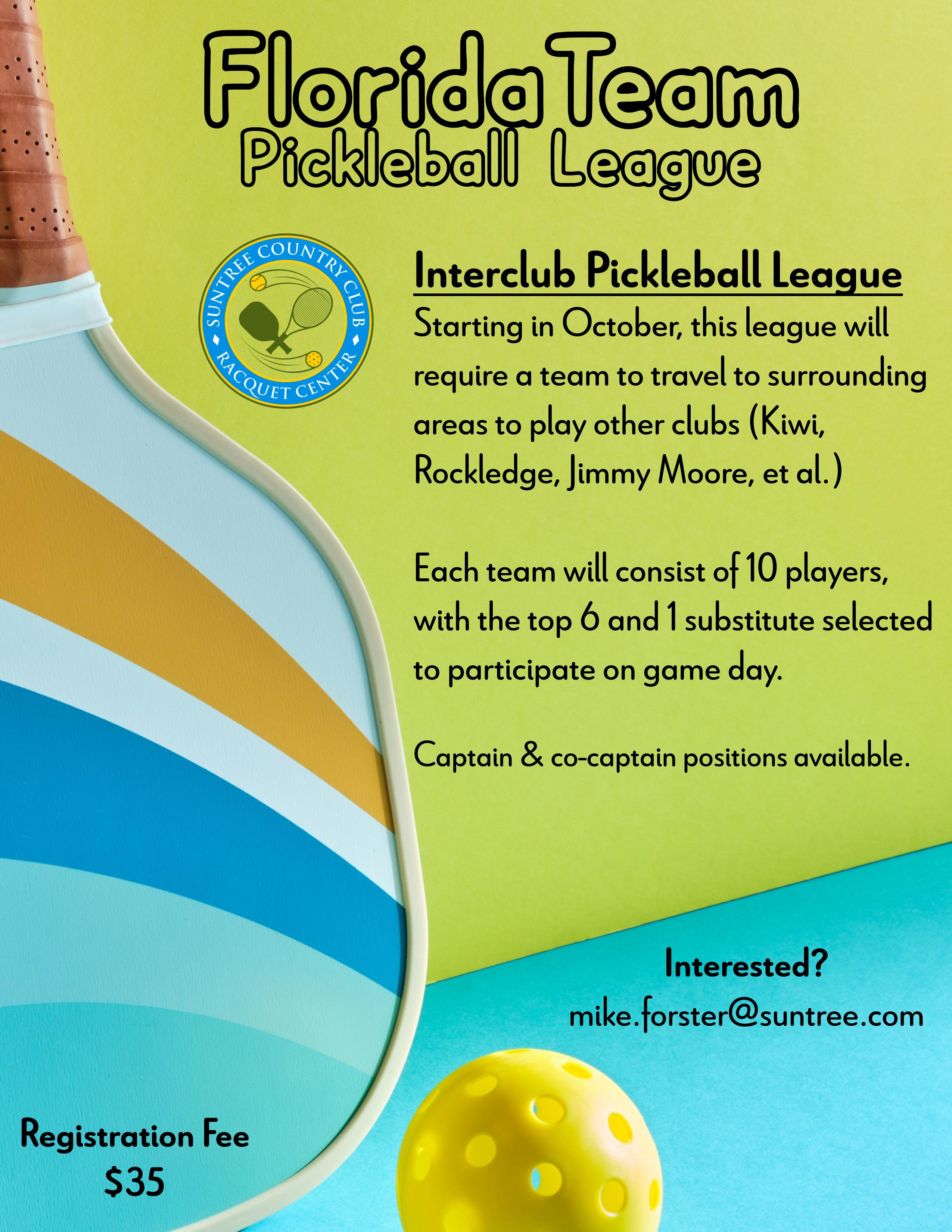 Florida Team Pickleball League : Starting in October with teams of 4 that can be men’s, women’s or mixed - contact Mike to sign up early or to ask any questions. We would love to have a few teams!