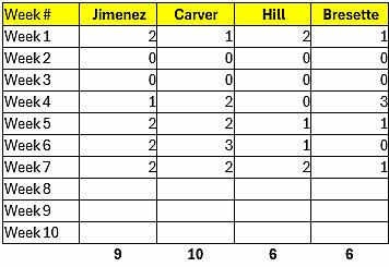 Carver Team leads the rankings so far with the highest total and average points. Jimenez follows closely, while Hill and Bresette are tied in total and average but differ slightly in max scores.