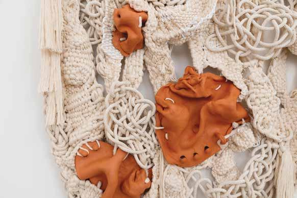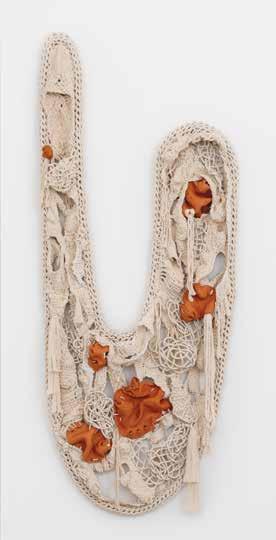 Tanya Aguiñiga was born in San Diego, California, and raised in Tijuana, Mexico. Her experiences as a binational citizen who crossed the border daily for school inform her approach to textiles and other forms of craft. Drawing on Mesoamerican and Indigenous Andean weaving traditions, Aguiñiga makes sculptures that are radically contemporary. Often they reference the human body, including terracotta hands and other body parts, or synthetic hair. She thinks of some of them as portraits—woven figures, sometimes interconnected like networks of family or friends.