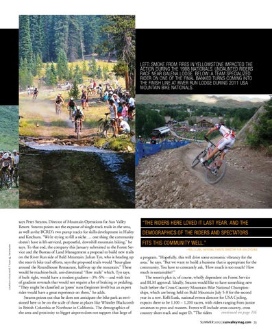 a program. “Hopefully, this will drive some economic vibrancy for the area,” he says. “But we want to build a business that is appropriate for the community. You have to constantly ask, ‘How much is too much? How much is sustainable?’” The resort’s plan is, of course, wholly dependent on Forest Service and BLM approval. Ideally, Stearns would like to have something new built before the Cross Country Mountain Bike National Championships, which are being held on Bald Mountain July 5-8 for the second year in a row. Kelli Lusk, national events director for USA Cycling, expects there to be 1,100 – 1,200 racers, with riders ranging from junior amateurs to pros and masters. Events will include cross country, cross continued on page 116 country short track and super D. “The riders Summer 2012 | sunvalleymag.com 73