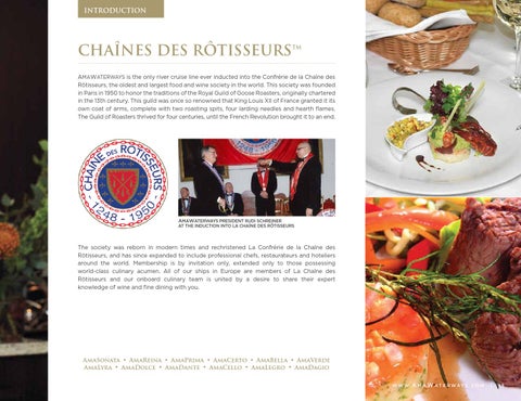 AmaWaterways is the only river cruise line ever inducted into the Confrérie de la Chaîne des Rôtisseurs, the oldest and largest food and wine society in the world. This society was founded in Paris in 1950 to honor the traditions of the Royal Guild of Goose Roasters, originally chartered in the 13th century. This guild was once so renowned that King Louis XII of France granted it its own coat of arms, complete with two roasting spits, four larding needles and hearth flames. The Guild of Roasters thrived for four centuries, until the French Revolution brought it to an end.