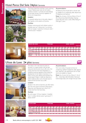 Location Situated in the centre of Sorrento, only 500 metres from the main square of Sorrento (Piazza Tasso). Shops, bars and restaurants are a short 5-10 minute stroll from the Club Ulisse.