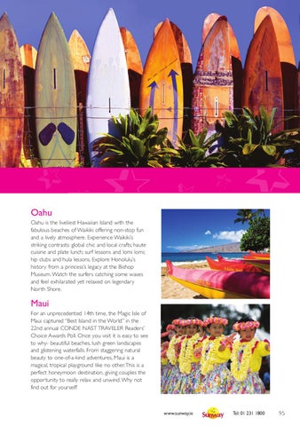 Oahu Oahu is the liveliest Hawaiian Island with the fabulous beaches of Waikiki offering non-stop fun and a lively atmosphere. Experience Waikiki’s striking contrasts: global chic and local crafts; haute cuisine and plate lunch; surf lessons and lomi lomi; hip clubs and hula lessons. Explore Honolulu’s history from a princess’s legacy at the Bishop Museum. Watch the surfers catching some waves and feel exhilarated yet relaxed on legendary North Shore.