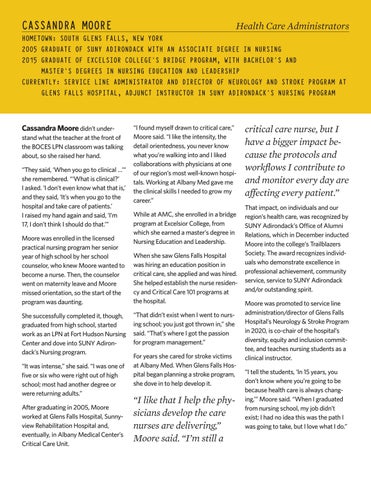 critical care nurse, but I have a bigger impact because the protocols and workflows I contribute to and monitor every day are affecting every patient.” That impact, on individuals and our region’s health care, was recognized by SUNY Adirondack’s Office of Alumni Relations, which in December inducted Moore into the college’s Trailblazers Society. The award recognizes individuals who demonstrate excellence in professional achievement, community service, service to SUNY Adirondack and/or outstanding spirit. Moore was promoted to service line administration/director of Glens Falls Hospital’s Neurology & Stroke Program in 2020, is co-chair of the hospital’s diversity, equity and inclusion committee, and teaches nursing students as a clinical instructor. “I tell the students, ‘In 15 years, you don’t know where you’re going to be because health care is always changing,’” Moore said. “When I graduated from nursing school, my job didn’t exist; I had no idea this was the path I was going to take, but I love what I do.”