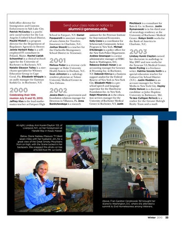 assistant for the Peterson Institute for International Economics. Kelly Crane is a coordinator for Schenectady Community Action Program in New York. Michael D’Ambrogio is a police officer for the New York Police Department. Andrew Greenspan is a senior administrative manager at HSBC Bank in Washington, D.C. Rebecca Graham Honan is an accounting manager for Genesee & Wyoming Inc. in Rochester, N.Y. Deborah Kim-Lu is a business support analyst for the Federal Reserve of New York in New York City. Elizabeth Miele is a preschool speech and language supervisor for the Hawthorne Foundation Inc. in New York. Ralph Minervino Jr. is the education services manager for the University of Rochester Medical Center in Rochester, N.Y. Justin