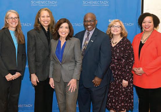 Dr. Steady Moono, College President, Ann Fleming Brown, Chair of the Board of Trustees, and Tiombé Tatum, Chief of Staff, with New York State Governor Kathy Hochul, RuthAnne Visnauskas, Commissioner and CEO of New York State Homes and Community Renewal, and Hope Knight, President, CEO, and Commissioner of Empire State Development.