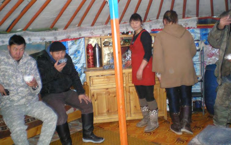 sisälle jurttaan ja sitoi se tuolini jalkaan kiinni, edes katsomatta solmua. Tarkistin sen ja se oli aivan oikea solmu siihen tarkoitukseen. Solmun tekotaito, tai toisaalta taito tulla toimeen ilman ompeleita, solkia tai niittejä, näkyi myös olevan tallella kaikkialla. Hevosten päitsissä tai satuloissa ei ollut solkia, niittejä tai ompeleita. Vaatetus on myös ollut tarkoituksenmukainen jo pitkään, esimerkiksi turkki ulottui yli 1.5 kertaa kantajansa ympäri. Oikea laita napitettiin vasempaan kainaloon turkin alapinnalle ja vasen puoli vastaavasti oikeaan kainaloon turkin ulkopuolelle. Näin leveät helmat voitiin kiertää polvien suojaksi ratsastettaessa. Rehua eläimille talvea varten kerättiin vain käyttöhevosille ja muutamalle maidossa olevalle lehmälle ja vuohelle, sekä mahdollisesti sairastuneille eläimille. Mitään katosta rehuille ei ollut, sillä aina on niin kuivaa että heinät eivät pilaannu.
