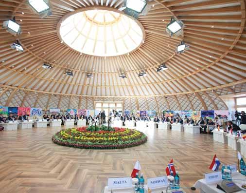 toimitti sen hotelliini. Niinpä pääsin osallistumaan virallisiin illallisiin ns. Tšingis-kaanin leirissä Ulaanbaatarin ulkopuolella. Kyseessä on vuorien ympäröimä turisteille rakennettu jurttakylä, jossa myös hieman aiemmin ASEMkokouksen osanottajat olivat vierailleet, kuten Ronny Rönnqvist kertoo toisaalla tässä lehdessä. Sen valtaisassa kokousjurtassa (”kunniagerissä”) olivat kaikkien osallistuneiden valtionpäämiesten valokuvat. Ikävä kyllä Juha Sipilä ei ollut päässyt esille, koska hän on ”vain” pääministeri. Leiriin saapuvia linja-autojamme oli vastassa kaksi Tšingis-kaanin ratsusotilasta täysissä varusteissa ja runsas illallinen nautittiin mongolien perinteisen musiikin (mm. kurkkulaulun) ja tanssin säestyksellä.