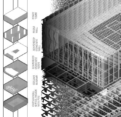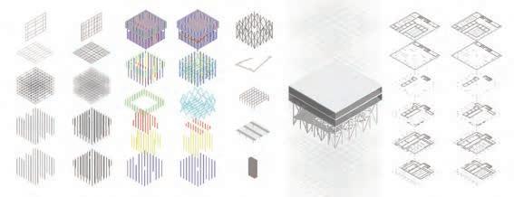 “Displacement” is the idea which follows the fact that gravity is, obviously , invisible and can be infinitely interpreted. The design process initiated from a three dimensional grid the defines points of structural support. The points of support are then randomly selected to place the base structure which transfer to different types of structure in each floor of the building. While the members of different structure types “displace” each other, they also serves the same purpose and stand above the sole truth of the whole thing : “gravity”