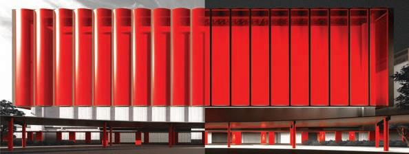 The wide drop-off area's roofing is made of translucent Shinkolite panels, allowing the structure's shadows to cast onto the ground. The drop-off leads to the main courtyard, where vent-block walls create a slow reveal transition.