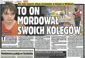lemy psychiczne dzieci. Zaznaczyła, że rodzice dostali „wiele sygnałów” alarmowych dotyczących ich syna, lecz „nikt na nie nie odpowiedział”. Ethan, który w momencie popełnienia zbrodni miał 15 lat, wziął z domu broń swojego ojca, schował ją do plecaka i poszedł do szkoły. Szkolny woźny nawet zażartował z wielkości i ciężaru jego bagażu, nie zajrzał jednak do środka. Chwilę potem Ethan otworzył ogień na szkolnym korytarzu. Jeszcze przed strzelaniną nauczyciele znaleźli w jego rzeczach rysunek broni i krwawiącego mężczyzny z podpisem „Myśli nie ustają. Pomóżcie mi. Wszędzie krew. Moje życie jest bezużyteczne”. Wezwany na rozmowę, stwierdził, że jest smutny po śmierci babci, a rysunek jest tylko ilustracją gry komputerowej. Psycholog stwierdził, że chłopcu pomoże przebywanie wśród rówieśników. Rodzice patrząc na rysunek nie zauważyli, że broń przypomina tę, którą James Crumbley kupił zaledwie cztery dni wcześniej. Nie powiedzieli też, że byli z Ethanem na strzelnicy. Po masakrze policja znalazła na dziennik chłopca, w którym opisywał planowaną zbrodnię. „Chcę pomocy, ale moi rodzice mnie nie słuchają” – pisał. Rodzice twierdzili, że nie zauważyli nic niepokojącego w zachowaniu syna. Trafią do innych więzień. Ethan Crumbley odsiaduje wyrok dożywocia. BUG