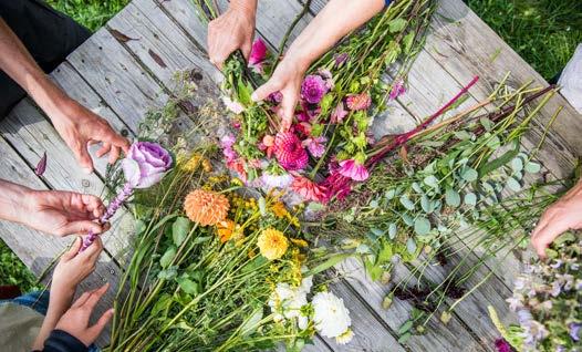 ‘Nee, dat kan niet. Zo zal je bij ons bijvoorbeeld geen rozen vin den. Ten eerste omdat we de seizoenen volgen, maar ook omdat we buiten telen, in weer en wind. Ons bloemenaanbod duurt on geveer 25 weken per jaar, afhankelijk van het weer. Doorheen het seizoen hebben we ongeveer honderd soorten. We beginnen in april met voorjaarsbloeiers zoals narcissen om te eindigen in de herfst met zinnia’s, rudbeckia’s en dahlia’s in vele soorten en kleuren. Wanneer het begint te vriezen, stopt ons bloemen seizoen.’