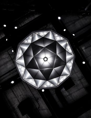 og kvinder. Under kundernes fødder ligger bløde Dinesen-planker på dele af gulvet i kontrast til enorme femkantede granitfliser med ensaretet ru overflade andre steder i huset. Midt i rummet rejser en trappe sig som en skulptur mod førstesalen, og over kundernes hoveder ses et loft, hvor alle installationer er sat op med den største akkuratesse og til sidst malet ensartede i sort. Løfter man blikket mod loftet på andensalen,