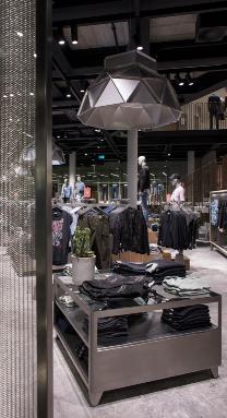 - Vi fik at vide, at vi skulle komme med det fedeste, vi kunne finde - uden at hælde bladguld ud over det hele. For nej, bladguld er der ikke noget af i butikken. Men det er måske så også det eneste eksklusive materiale, man ikke finder. I dameafdelingen er alle hylder og tøjstativer designet hos Riis og udført i brændt rustfrit stål, der giver materialet en messing-agtig og