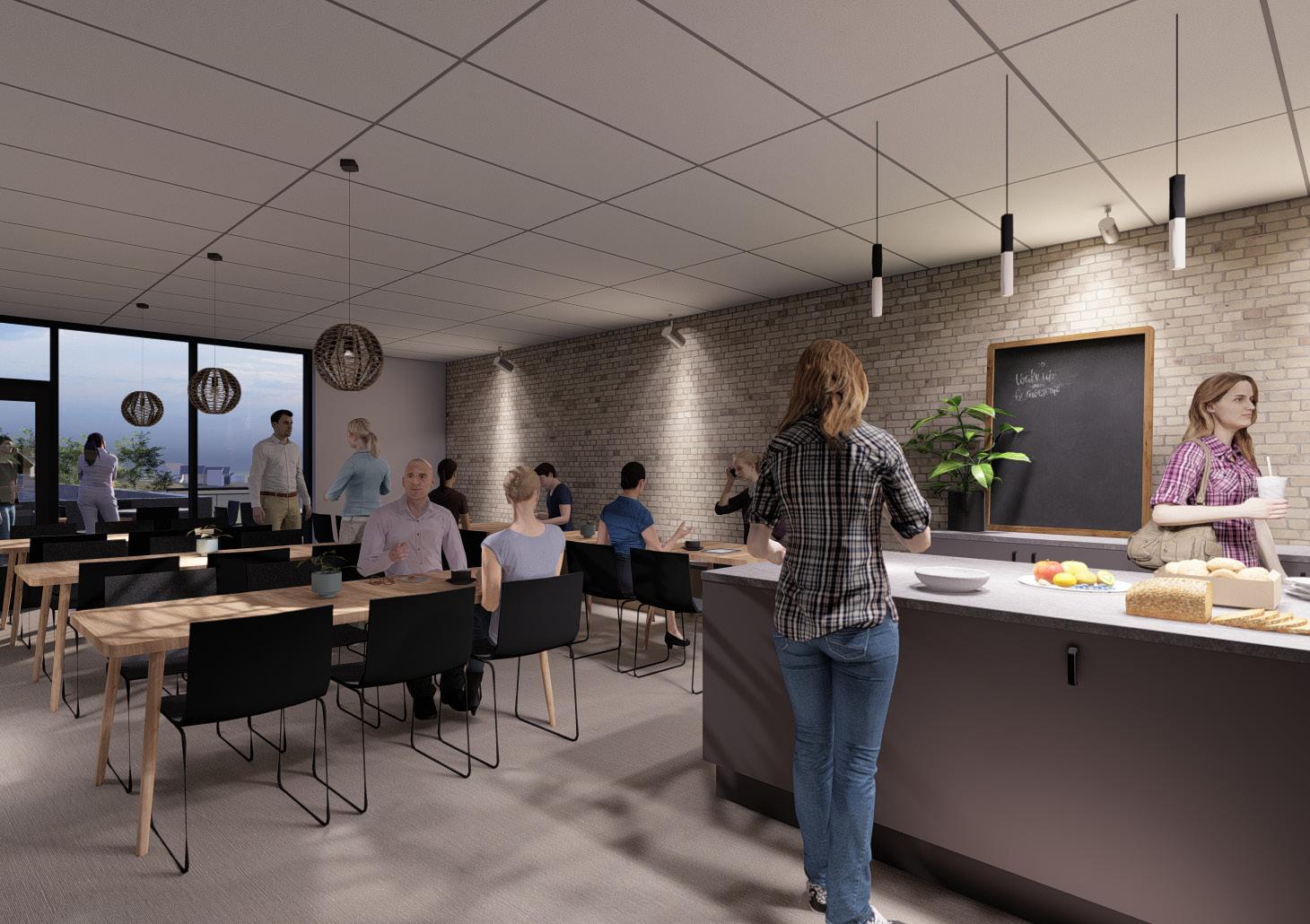 Kunnskapsparken vil ha flere møterom som leietakerne kan reservere, og en felles kantine i andre etasje med tilhørende terrasse der man kan nyte lunsjen en solfylt dag.