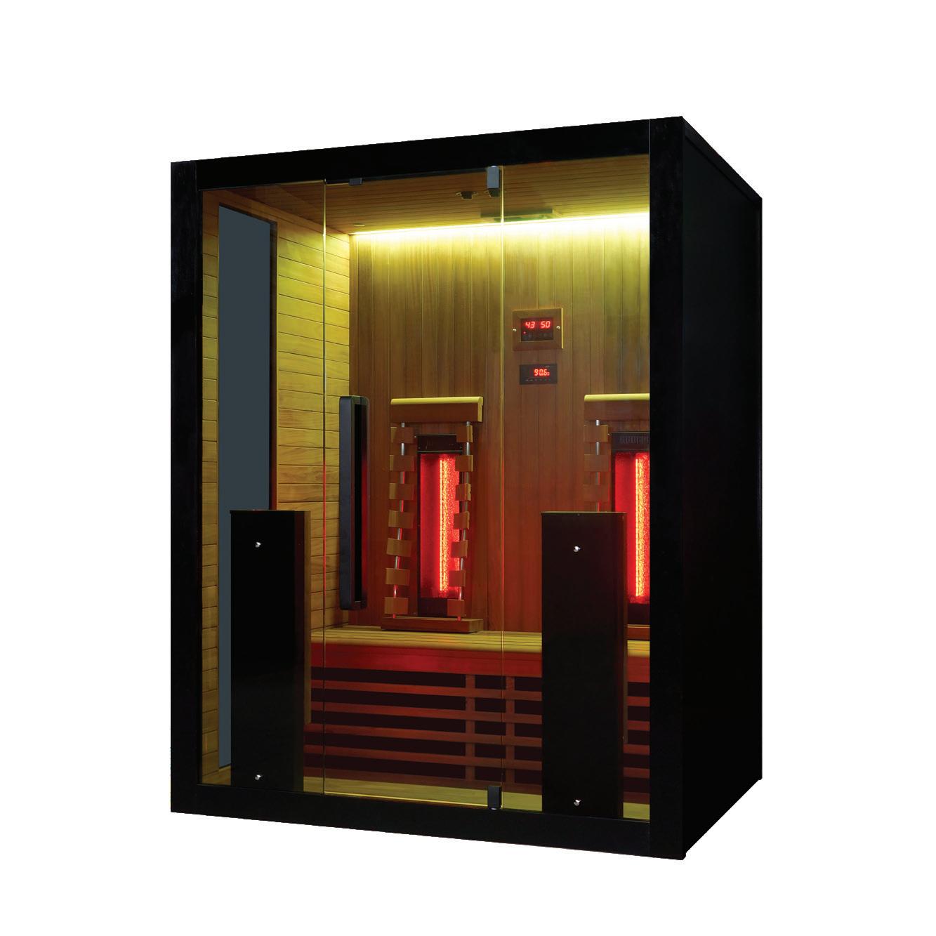 Infrared saunas run at a lower temperature than a traditional sauna, heating your body directly rather than the air around you. Your core body temperature is raised as infrared light rays penetrate the deeper layers of skin and muscle to generate an intense sweat. Our saunas have a temperature range between 35°C–60°C which can offer a more comfortable sauna experience without compromising on the therapeutic benefits of the tradition. All models feature a stylish black external veneer and a crafted, thermo Aspen wood interior.