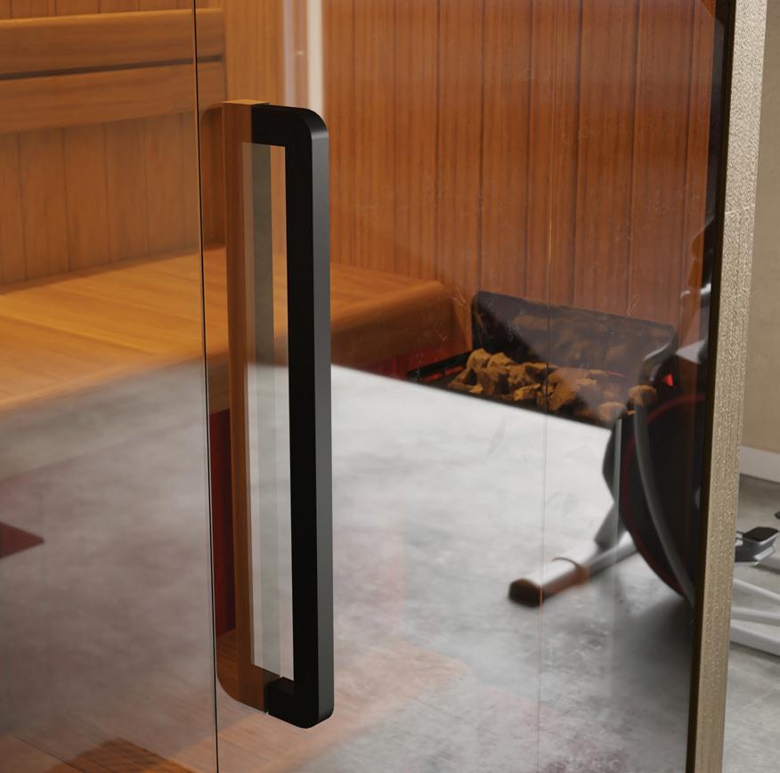 Thermowood, our 100% natural, chemical-free treated wood used to craft our indoor saunas, is safe and durable, as well as attractive in appearance. Our traditional models have a built-in floor grid, covered in a vinyl surface, that considers safety and aesthetics with a non-slip grip. Grey safety glass encloses the space.