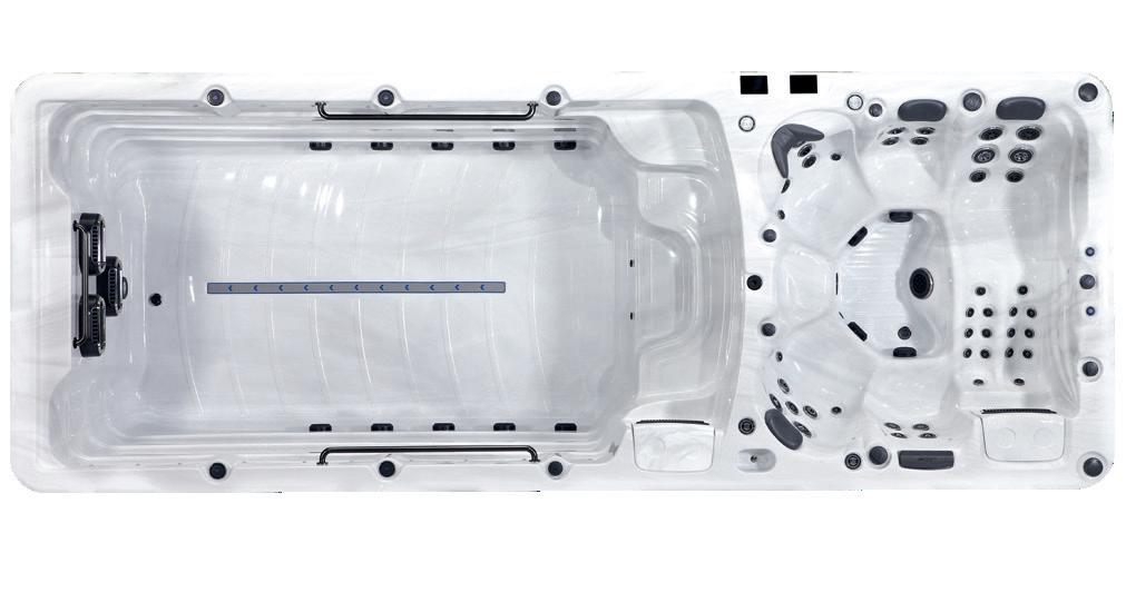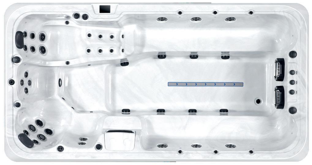 In den Swim Spas mit doppelter Temperatureinheit, wo es eine Abtrennung zwischen dem Schwimm- und Whirlpoolbereich gibt, kann die Whirlpoolseite des Geräts auf 40 Grad erhitzt werden.