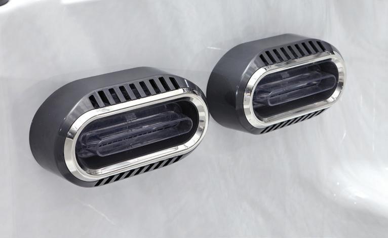 Die Deluxe-Serie bietet die perfekte Kombination aus Stil und Funktion. Mit sechs bogenförmigen Düsen, die genau auf die wichtigsten Muskelgruppen ausgerichtet sind, bieten diese Düsen eine sanfte, aber effektive Hydrotherapie, die Verspannungen löst und Entspannung fördert.
