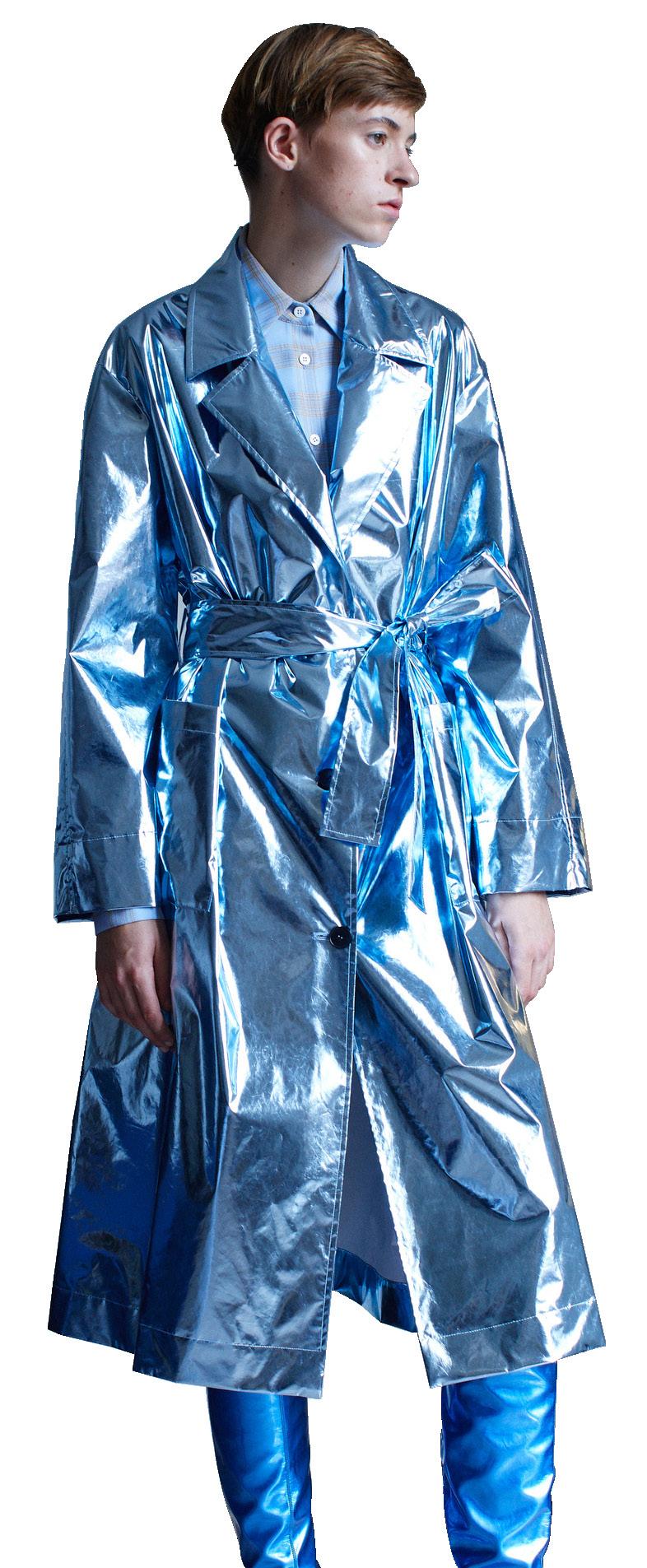 Taking a trip down memory lane, Arthur Arbesser restored a carefree spirit with his colourful Spring 2022 collection. Creative doodles and sketches inspired the looks on the runway. This particular look, however took a different route. Although it doesn’t include any bold patterns, it is still a bold look nonetheless. In a shade similar to the Mara 195 thread, the unique iridescent blue trench coat has Rockstar status and is full of fun. Its monotone style allows an otherwise statement piece to be easily paired with neutral pieces like a black button-up or a pair of black trousers.