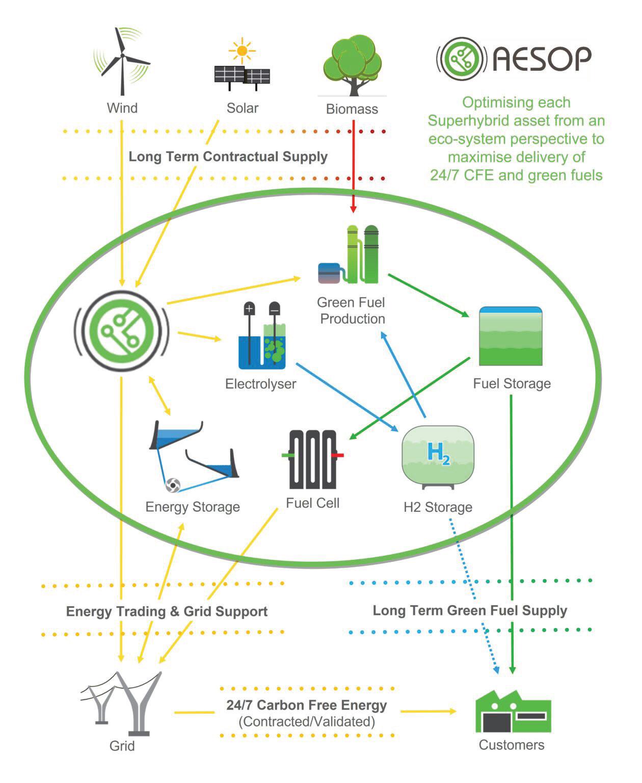 This Superhybrid system combines longduration energy storage, like pumped hydro, with flexible loads, such as e-methanol production. E-methanol is produced and stored, allowing the system to sell it as a fuel or ramp up electricity production when the market demands it.