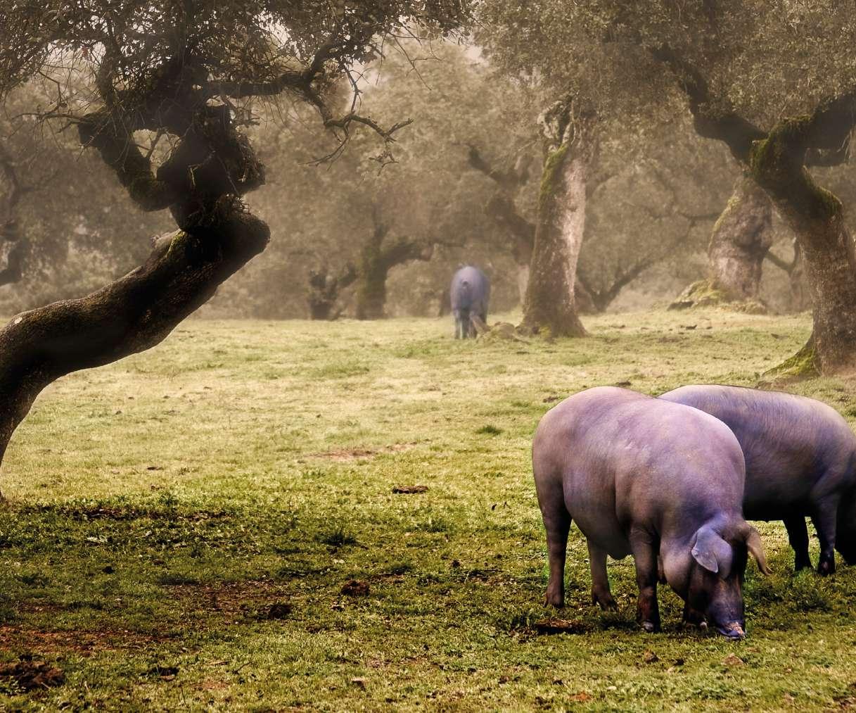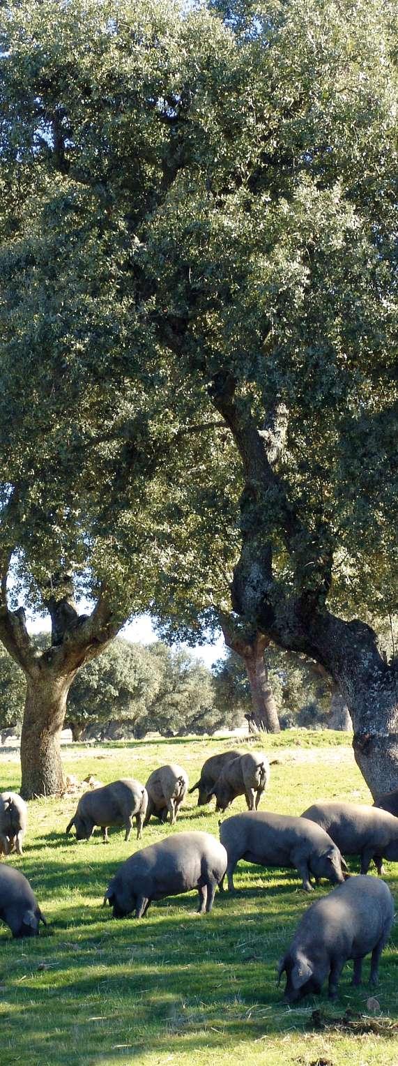 En esta época del año, el cerdo se alimenta de bellota. Su periodo de engorde dura un mínimo de 60 días. Nunca hay más de 2 cerdos por hectárea.