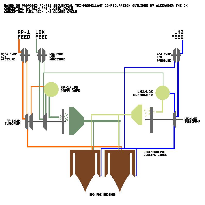 from Earth to Trans-Lunar Injection (TLI). The propulsion system will integrate onboard kerosene & hydrogen in tripropellant operation inspired by a conceptual RD-701 design [8], originally being developed for the Soviet MAKS spaceplane (Figure 2). The vehicle is designed with a fuel mass fraction capped at 25%, balancing performance and payload capability to facilitate cost-effective, reusable space access for the masses.