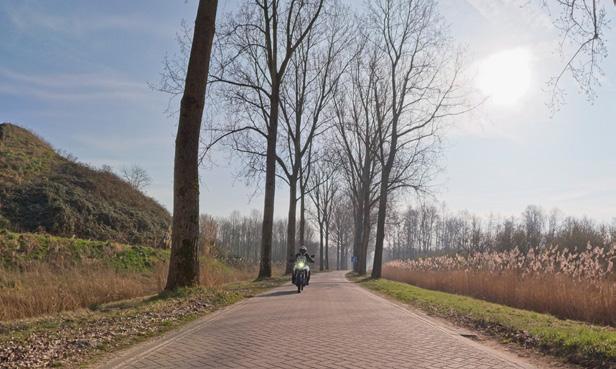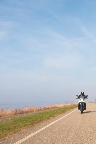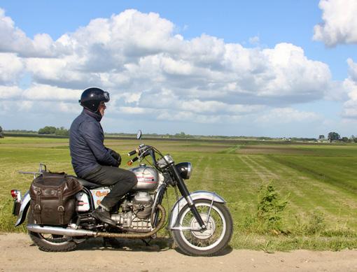Ik start de Guzzi en vervolg mijn pad over het slingerende dijkweggetje richting Steenwijk. Behalve één auto kom ik geen enkel ander vervoermiddel tegen, blijkbaar staat dit dijkweggetje nog niet op de radar van horden motorrijders of fietsers. Het zal ongetwijfeld mijn verbeelding zijn, maar ik heb het gevoel dat Guus extra zijn best doet om ’t mij, zijn trotse eigenaar, naar de zin te maken. Sinds hij door Henk Boon en Oebele Herder opnieuw is opgebouwd, pakt hij feilloos op en swingt hij als een jonge god door de bochten, en dat voor een motor van een halve eeuw oud. Een glimlach drukt op mijn gezicht.