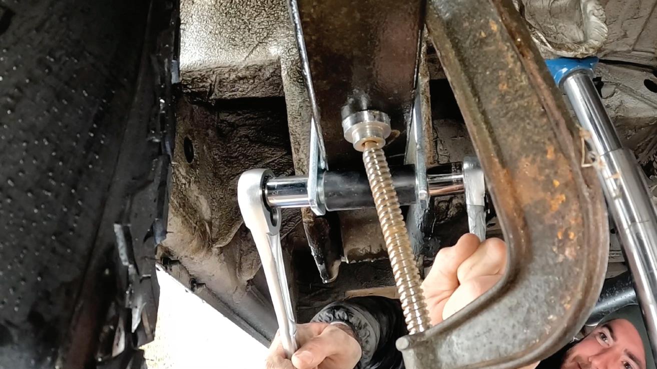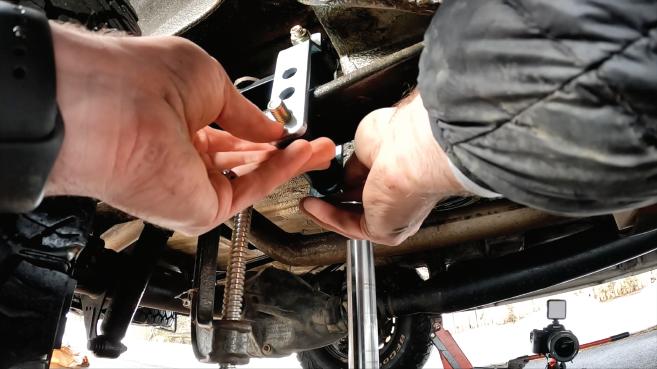 It is a good idea to hit the nuts on the U-bolts with some PB Blaster to help make it easier to loosen them. A er giving the PB Blaster a couple of minutes to penetrate, you can use the breaker bar with the 19mm deep socket to loosen the nuts.