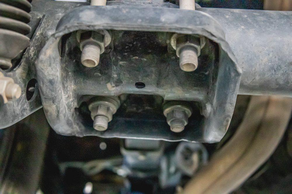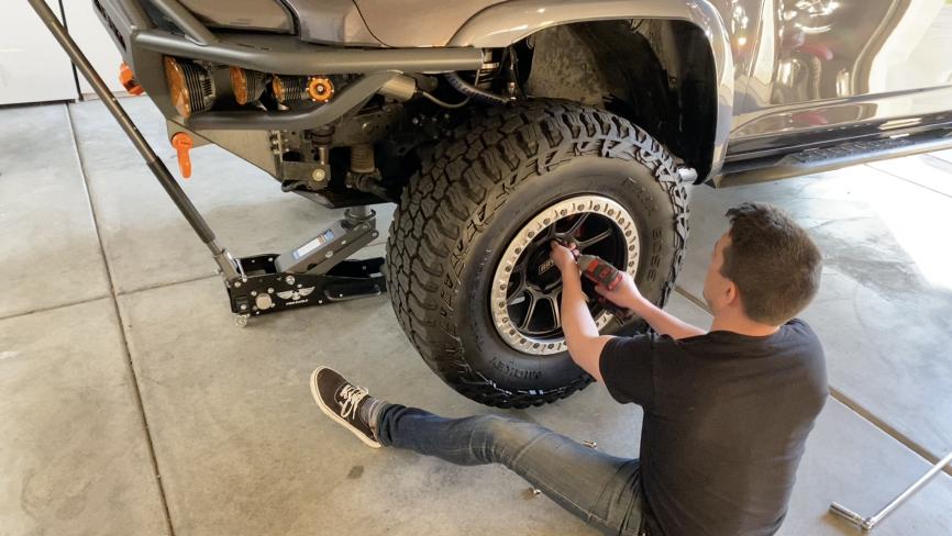 Before attempting to remove the stock bump stops, you will need to put tire chocks in front of your tires and pull the emergency brake so your truck doesn’t move while you are working on it.