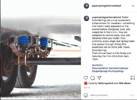 “We’ve spent the last few years building a partnership and getting our heads together trying to gure out how we can deliver a better end experience. The team at United RV believes enough in our Trailer SumoSprings (a product that’s up 600% this year) – they are going to be putting them on every towable unit that leaves their lot, exclusively. I think that this is a component of leadership, a di erentiator.”