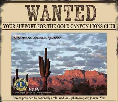 You Know you want to help your community, but you don’t know how! Well Gold Canyon Lions will make it easy for you. All you need to do is purchase your Superstition Mountain Splendor-Gold Canyon Lions 2026 Charity Calendar, for a $10 donation, then you will be helping your Gold Canyon Lions serve your community with service hours and financial donations, that help and support many local worthy causes and organizations.