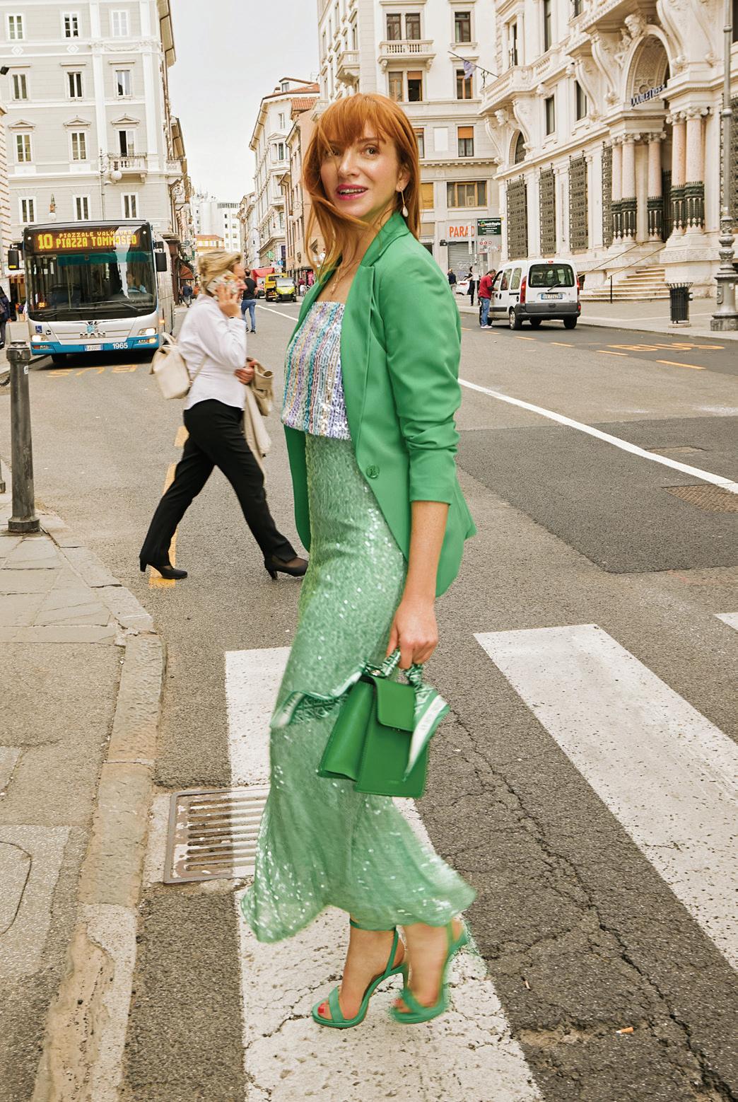 Zeleno krilo z bleščicami, visoke pete in naravnost čez prehod za pešce! Obožujem bleščice.