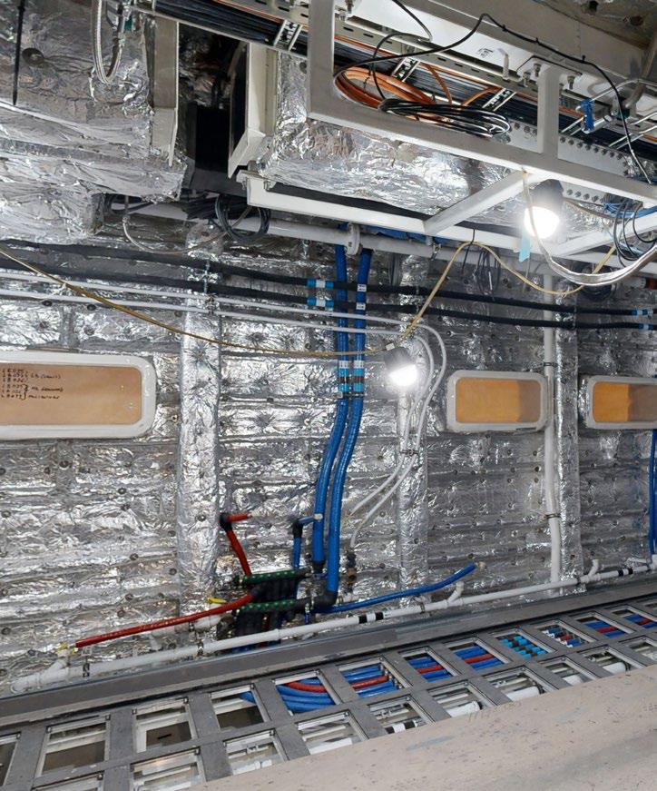 The yacht is designed for cruising in a variety of climates, including tropical regions. To this end, there are dedicated chillers not only for the HVAC system, but also for galley equipment such as refrigerators, freezers, and icemakers. High exterior temperatures and warm seawater also mean higher risk of condensation and metal areas prone to temperature differences are treated with Mascoat, an anti-condensation coating that also assists in damping vibrations that cause noise. The yacht’s systems include moisture sensors in voids behind wall panels or under flooring so that any condensation can be detected before it becomes problematic.