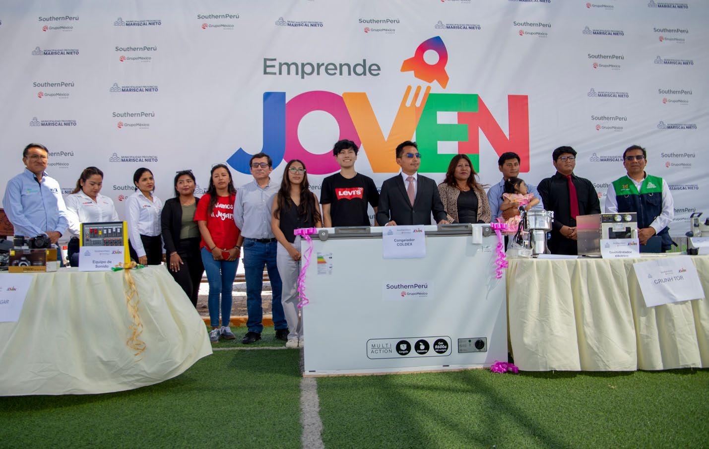 Jóvenes moqueguanos ganadores del concurso “Emprende Joven” que promueve Southern Perú y la Municipalidad provincial Mariscal Nieto, recibieron capital semilla en bienes y materiales con los que fortalecerán los pequeños negocios que tienen en marcha.