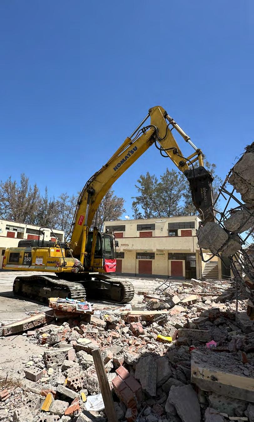 Para ello, la empresa movilizó maquinaria pesada proveniente de sus operaciones en Ilo, a fin de agilizar el proceso. Con una potente retroexcavadora PC350 equipada con un martillo hidráulico, se aseguró el avance de los trabajos de demolición.