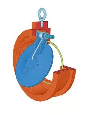 b) Wind the spring (5) 180° in a clockwise direction. Place the wound spring (5) in position between the disc hinge lugs ensuring the long convex side of the spring’s leg is against the disc, the other end must be energised against the wall of the valve as per the Diagram 4. Different sizes and classes may have different spring configurations. While maintaining pressure on the spring (5), insert the hinge pin (3) into the body (1) passing it through the bushings (6) (where required), disc (2) and spring (5) as detailed above in paragraph a).