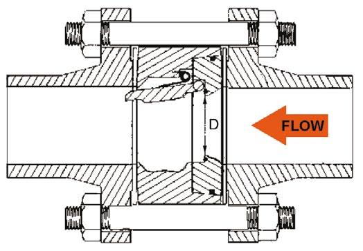 Insert valve into pipeline only in the upright position for horizontal service. Install the valve as shown below so the flap hinge is at the top of the valve and is centred. Where provided, the lifting lug can serve as a guide. For SLP series the side pin retainer can also be used as a guide. For vertical services the valve must be used for upward flow only, refer to the arrow on the valve body indicating direction of flow, refer Diagram 1. DIAGRAM