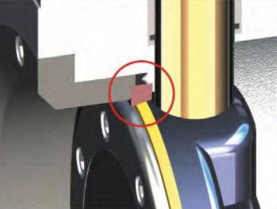 The valve stem is offset from the seat area (1st offset) and the valve seat surface centre line is offset against the centre line of the pipe (2nd offset) and the conical axis is offset from the valve centre line (3rd offset: inclined cone). The 3rd offset completely eliminates rubbing or scraping. The seat surfaces of the body and seal ring in this triple offset design, contact with an inclined “cone-in-cone”, and this design requires precision seating tolerances and durability to ensure a slight precision lapped wedge-mating effect. In addition, the angle of contact between the body and seat ring provides a low opening and closing torque due to almost no wedging and no scraping action on opening or closing (unlike trunnion mounted ball valves). This eccentric triple offset design provides excellent sealing performance and seat durability and it hardly ever needs repair under normal service conditions.