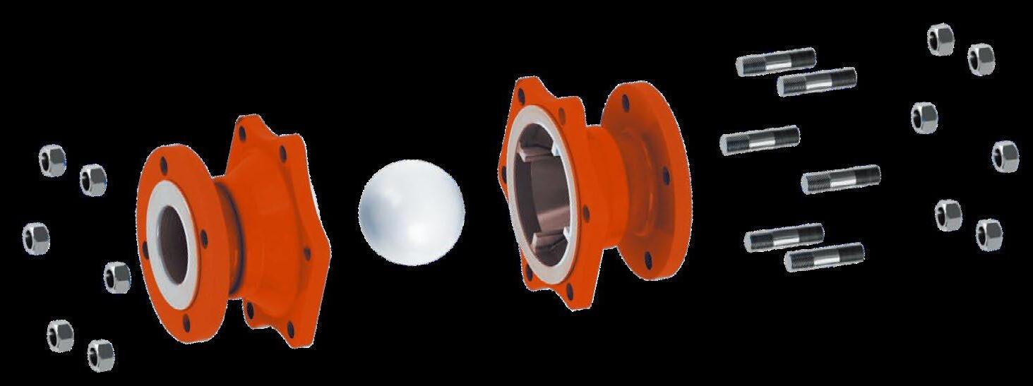 Simple three parts design, with only one moving part. Disc 100% leak tight, 0.035 bar back pressure. Full bore design for minimum flow turbulence. Flap also serves as gasket seal between body and end piece. Valve usable in vertical or horizontal plane. Downtime is kept to a minimum as the flap can easily be replaced in minutes.